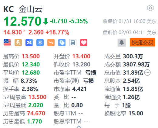 美股异动丨金山云盘前涨超18% DeepSeek新模型料对云端影响正面