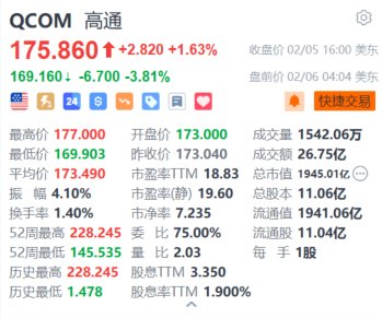 格隆汇2月6日|高通(QCOM.US)盘前跌3.8%,报169.16美元。消息面上,高通第一财季营收同比增长17%至116.7亿美元,分析师预期109.3亿美元;调整后每股收益同比增长24%至3.41美元,分析师预期2.97美元。期内半导体业务(QCT)的收入同比增长20%至100.8亿美元;其中,核心的手机业务收入同比增长13%,汽车业务增速由三季度的68%放缓至60%。