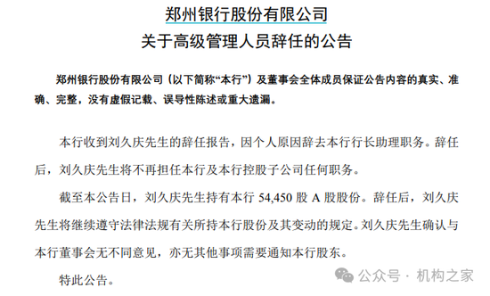 图:郑州银行公告刘久庆辞任行长助理