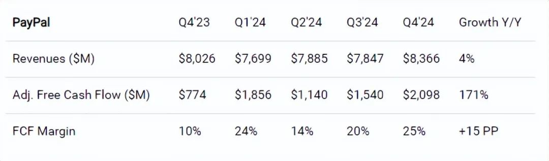 PayPal 的自由现金流强劲、积极的资本回报和活跃账户增长反弹是继续推荐这家金融科技公司股票的三个原因。活跃账户增长正处于PayPal 的转折点。这家金融科技公司在 2024 年第四季度实现了强劲的活跃账户增长,季度账户净增超过 200 万,并受益于其自由现金流的大幅上升,再加上新的股票回购授权,可能会在 2025 财年带来可观的资本回报。