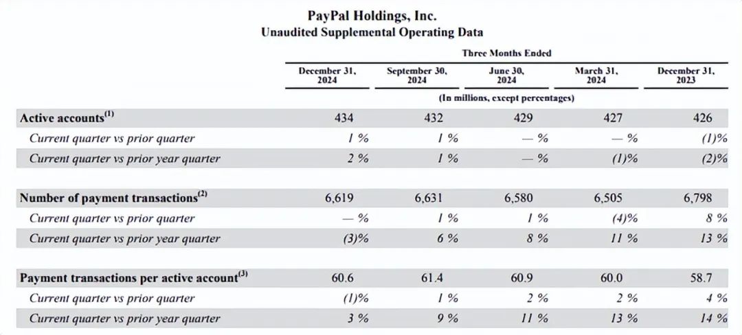 2024 财年末活跃账户总数为 4.34 亿,环比增长 260 万(+0.6%),连续第二个季度实现账户增长。支付交易数量也有所增加,表明支付处理公司客户货币化程度提高,2025 财年有机收入增长潜力巨大。12 月季度,PayPal 每个活跃账户的交易量达到 60.6,比去年同期增长 3%。