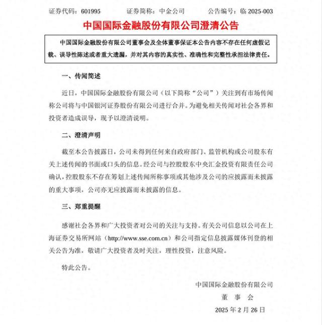 针对市场传闻,2月26日晚间,中金公司发布澄清公告表示,截至本公告披露日,公司未得到任何来自政府部门、监管机构或公司股东有关上述传闻的书面或口头的信息。经公司与控股股东中央汇金投资有限责任公司确认,控股股东不存在筹划上述传闻所称事项或其他涉及公司的应披露而未披露的重大事项,公司亦无应披露而未披露的信息。