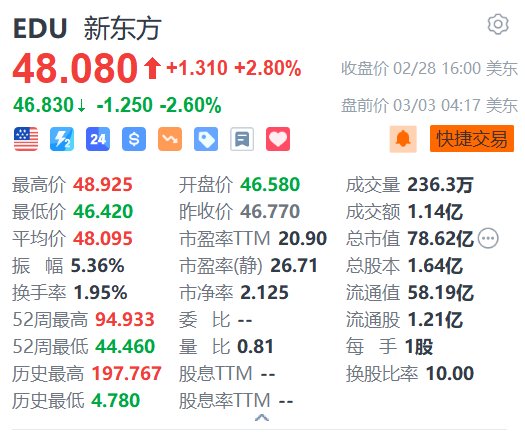 格隆汇3月3日|新东方(EDU.US)盘前跌2.6%,报46.83美元。消息面上,近日,在《酌见》栏目中,新东方董事长俞敏洪与格力电器董事长董明珠谈及接班人一事,俞敏洪称现在为止新东方都没找到接班人。关于退休,俞敏洪曾在2022年提到,自己10年内一定会从新东方退休。退休并不是指完全不上班,而是不再陷入到新东方的具体事务中去。(格隆汇)