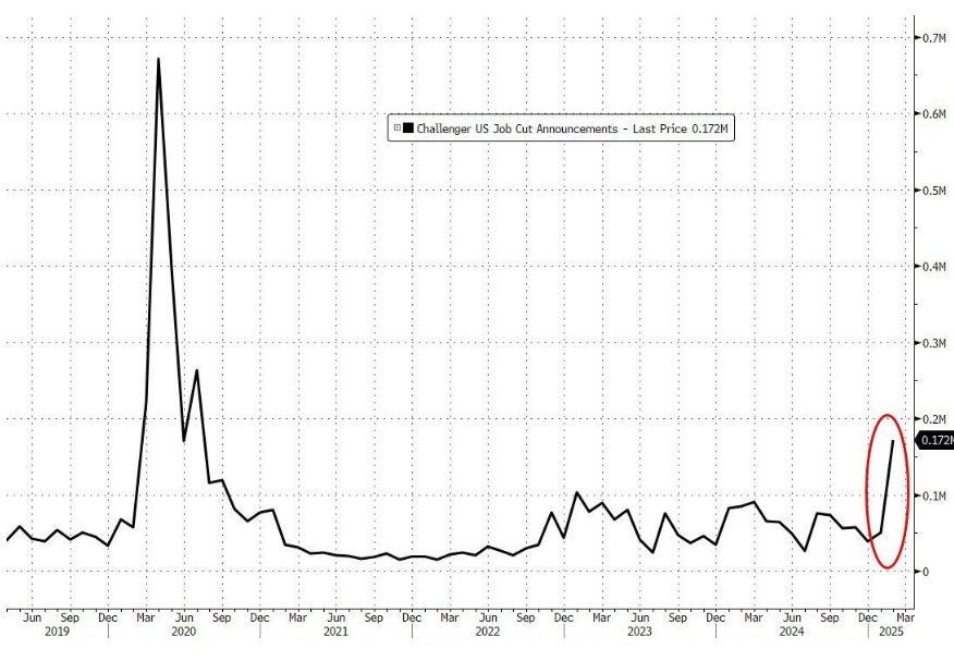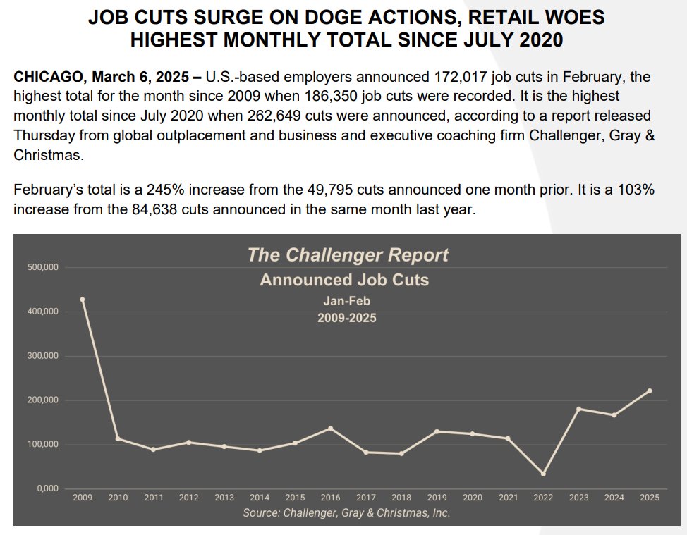 报告指出,美国私营企业上个月宣布了削减成千上万岗位的计划,特别是在零售和技术行业。“政府效率部”行动的影响,以及政府合同的取消、对贸易战的担忧和破产事件的发生,引发2月裁员人数激增。