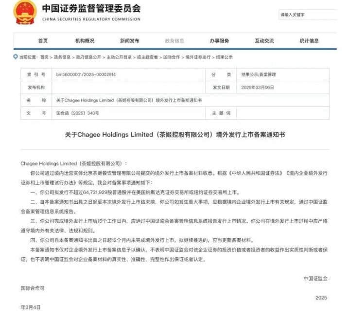 橙柿互动获悉,3月6日,中国证监会国际合作司发布关于霸王茶姬境外发行上市备案通知书,公司拟发行不超过64731929股普通股并在美国纳斯达克证券交易所或纽约证券交易所上市。
