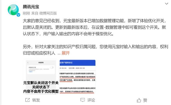 新浪科技讯 3月5日下午消息,针对腾讯元宝App旧版本用户协议内含“霸王条款”引发热议一事,腾讯元宝于微博回应称:“大家的意见已经收到,元宝最新版本已增加数据管理功能,新增了体验优化开关,且默认是关闭的,更新到最新版本后,在设置-数据管理中即可看到这个开关。”