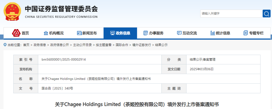 近日,中国证监会国际合作司发布关于Chagee Holdings Limited(茶姬控股有限公司)境外发行上市备案通知书(国合函〔2025〕340号)。