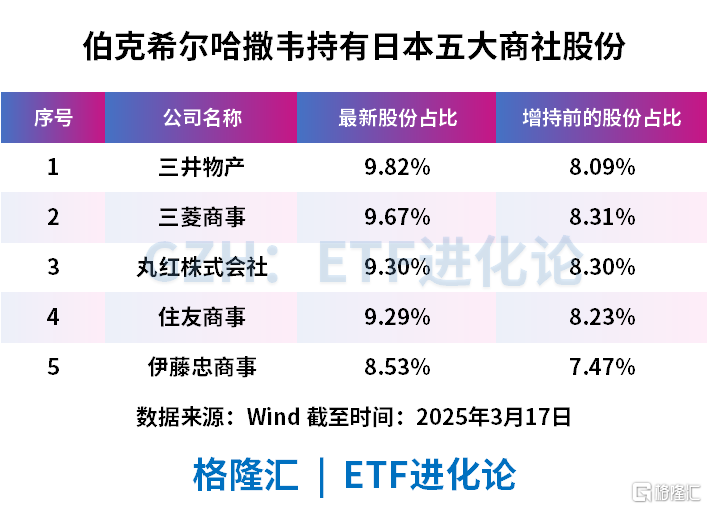 2020年8月首次披露买入五大商社,每家持股比例约5%,总投资约62.5亿美元;2023年6月,伯克希尔进一步增持,持股比例升至约8%。
