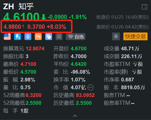 格隆汇3月26日|知乎(ZH.US)美股盘前涨8%。消息上,公司公告,2024年全年总收入为人民币35.99亿元,同比下降14.5%。毛利率由2023年的54.7%提高至60.6%。净亏损人民币1.69亿元,去年同期净亏损人民币8.39亿元。经调整净亏损人民币9630万元,去年同期经调整净亏损人民币6.59亿元。公司董事长周源表示,2024年对知乎具有重要转折意义,社区生态得到优化,用户指标全年持续向好。(格隆汇)