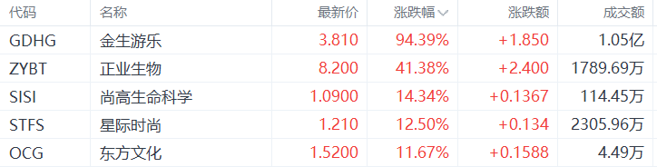 格隆汇3月26日|中概股收盘涨幅前五的个股为:金生游乐涨94.39%两日累涨超171%,正业生物涨41.38%,尚高生命科学涨14.34%,星际时尚涨12.5%,东方文化涨11.67%。(格隆汇)
