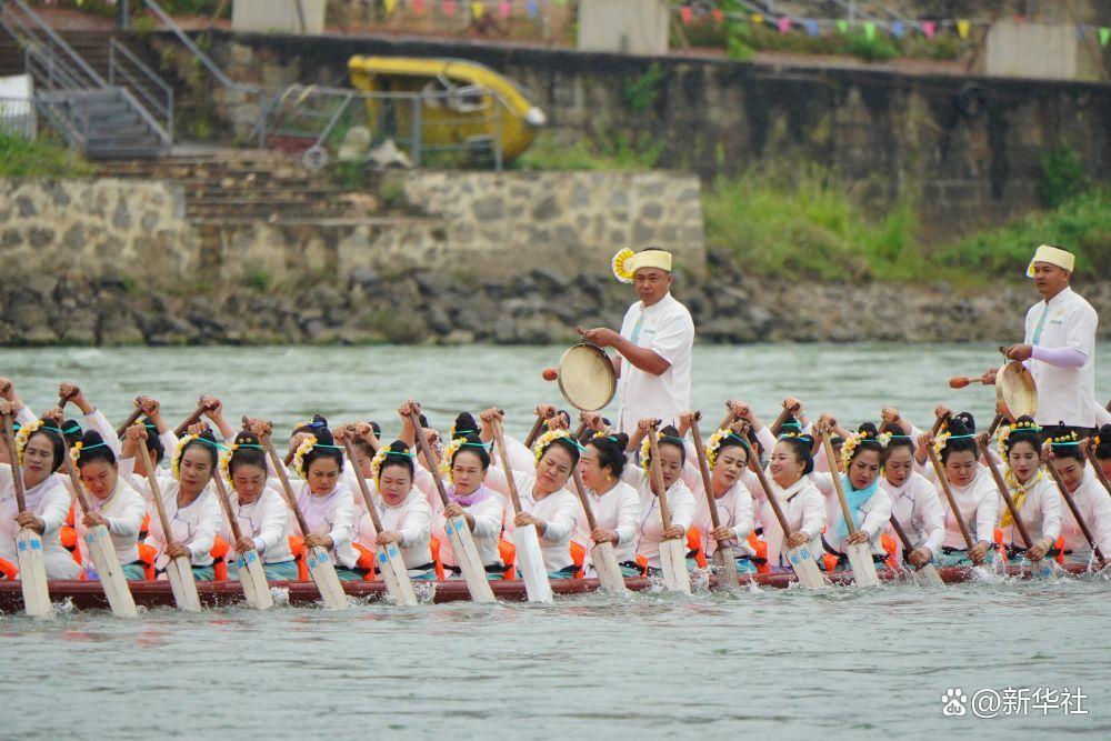 4月13日,在西双版纳傣族自治州景洪市,人们参与传统龙舟表演赛。 新华社记者 高咏薇 摄