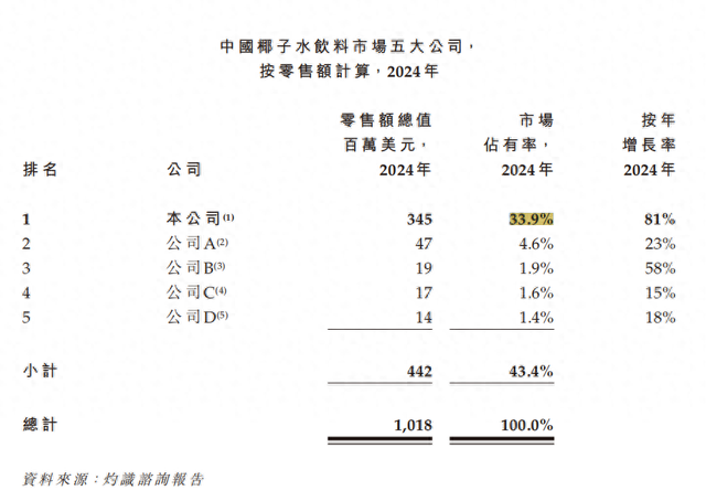 IFBH招股书援引的灼识咨询报告数据,按零售额计算,该公司于2024年在中国内地椰子水饮料公司中排名第一,本公司市场占有率为33.9%,领先第二大公司超7倍。