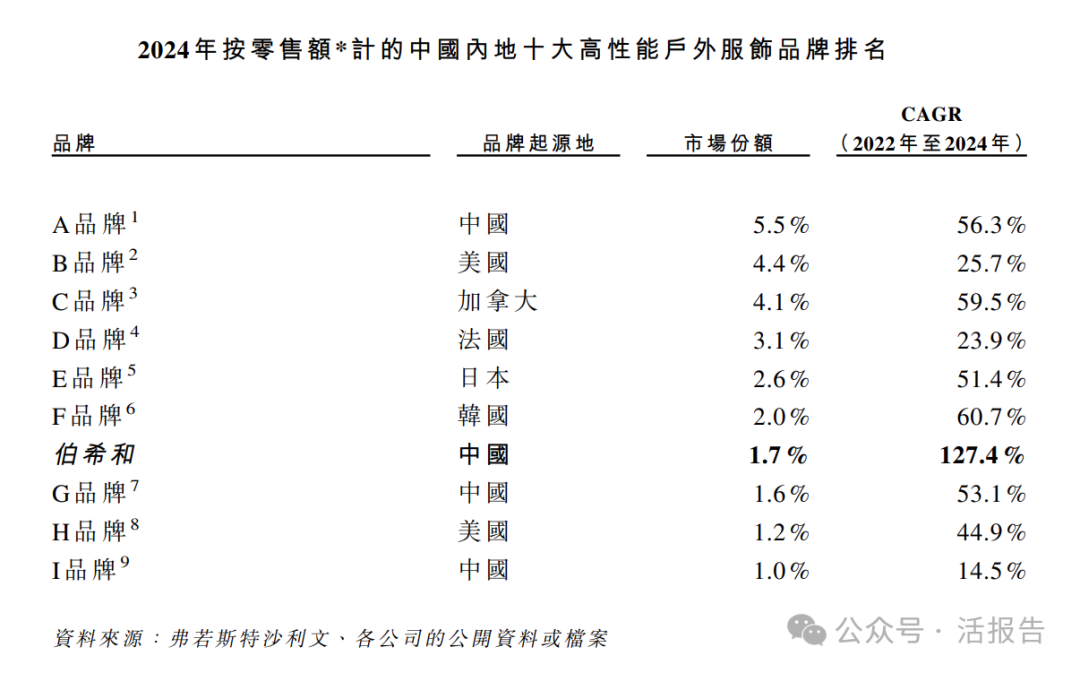 根据弗若斯特沙利文的资料,伯希和为中国内地十大高性能户外服饰品牌中增长最快的品牌,2022年至2024年按零售额计的CAGR为127.4%。于2024年,按零售额计,伯希和为中国内地三大国产高性能户外服饰品牌之一。