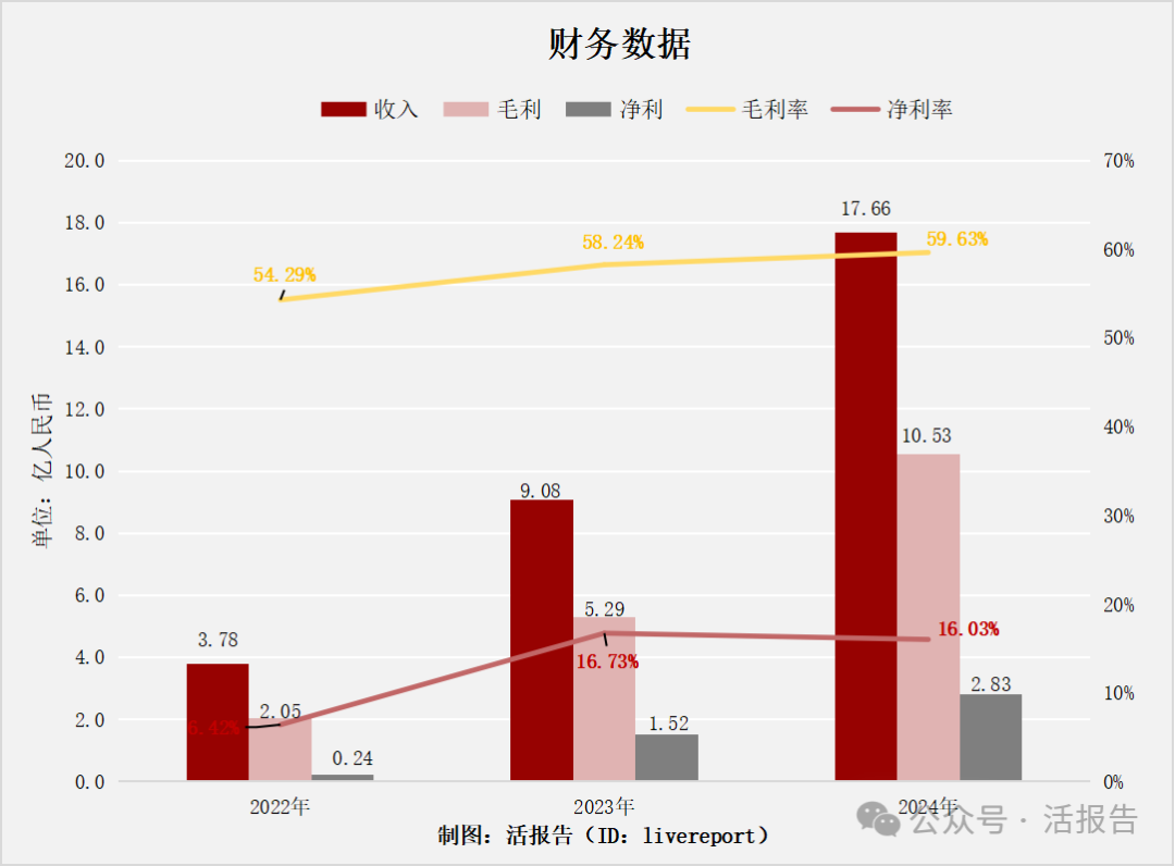 公司是2024年中国内地发展最快的高性能户外服饰品牌,2024年收入17.66亿元人民币,毛利润为10.53亿元人民币,毛利率达59.6%左右,净利润达2.83亿元人民币。