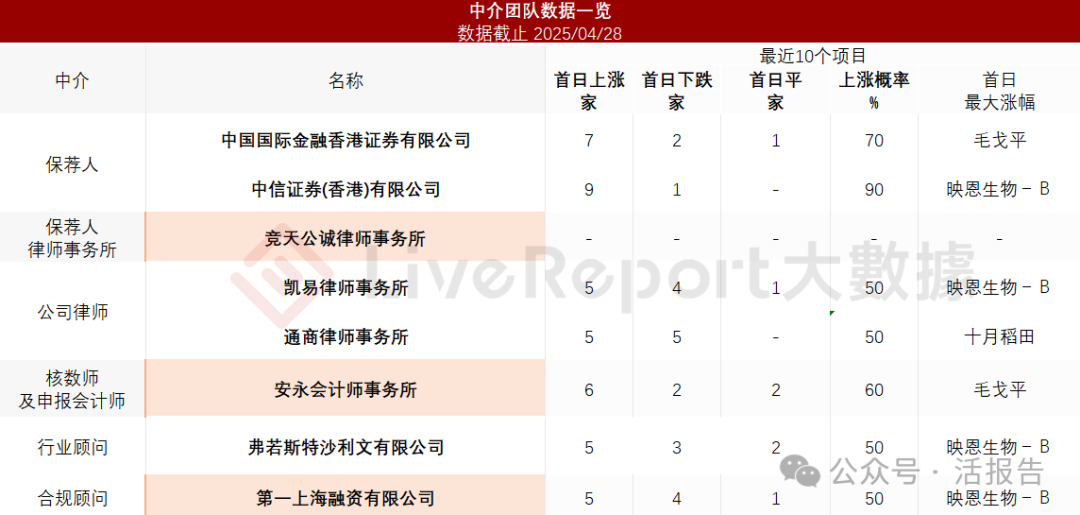 据LiveReport大数据统计,伯希和中介团队共计8家,其中保荐人2家,近10家保荐项目数据表现不错;公司律师共计2家,综合项目数据平平无奇。整体而言中介团队历史数据表现一般。