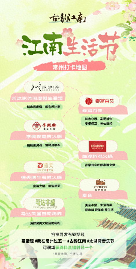 公开资料显示,“江南生活节”是抖音生活服务的特色IP活动。今年3月至12月,活动将面向南京、苏州、无锡、徐州、常州等13个江苏设区市,围绕53个“江苏味道”美食街区,分四季落地系列活动。通过线上话题、达人探店、直播引流、专项补贴等形式,助力商家提升数字化经营能力,为用户奉上极具地方特色的消费选择。太湖湾音乐节是 “江南生活节” 在常州落地的重要活动之一。