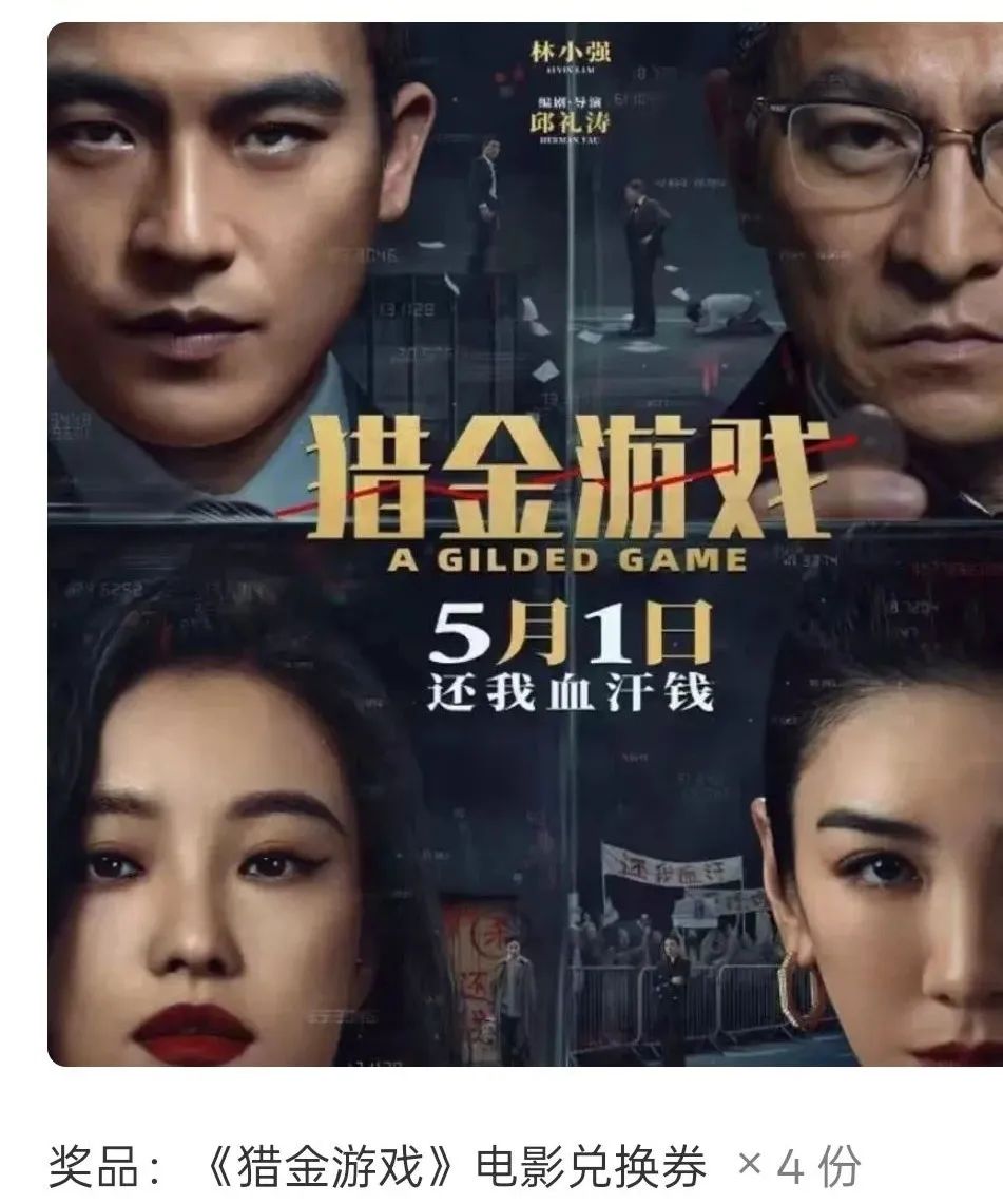 奖品为电影《猎金游戏》兑换码8张!(1人2张,一共4人中奖)