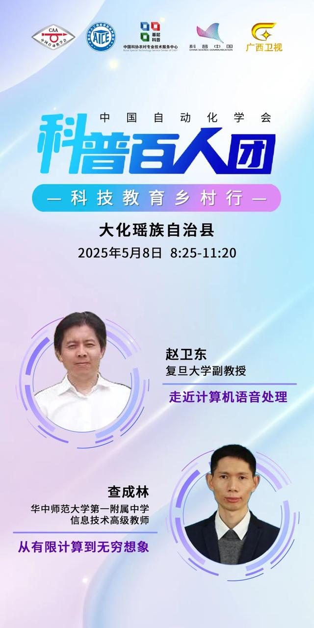 为进一步支持国家乡村振兴重点帮扶县,下沉优质科普资源,中国自动化学会(简称“CAA”)联合中国科协农村专业技术服务中心共同开展2025年“科普百人团一科技教育乡村行”公益活动。CAA普及工作委员会、CAA智慧教育专业委员会、广西壮族自治区科学技术协会、河池市科学技术协会、大化瑶族自治县科学技术协会共同承办“科普百人团一科技教育乡村行·广西大化瑶族自治县”公益活动。5月8日,科学家引领科普百人团“线上+线下”开讲,走进大化瑶族自治县实验小学、大化瑶族自治县第三小学、大化瑶族自治县新城小学、大化瑶族自治县高级中学和大化瑶族自治县实验中学“讲好一堂人工智能启蒙课”,为青少年提供一个了解人工智能的平台,将科技送到孩子们的身边,提高青少年对人工智能的认识和兴趣。