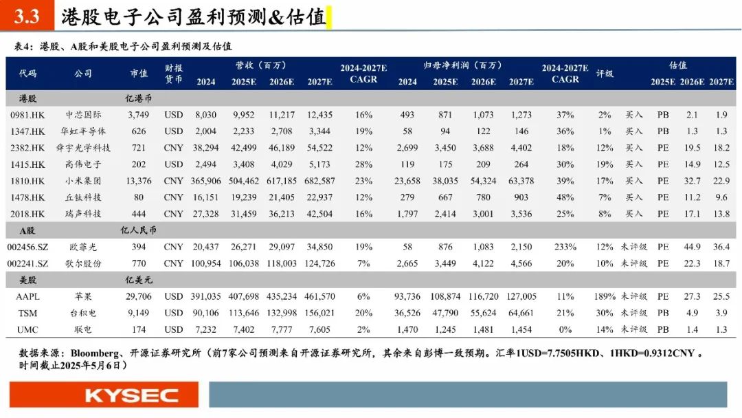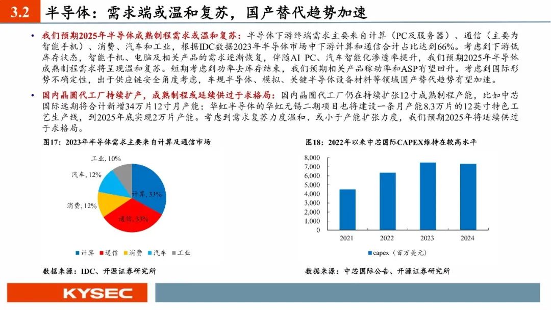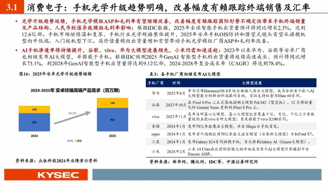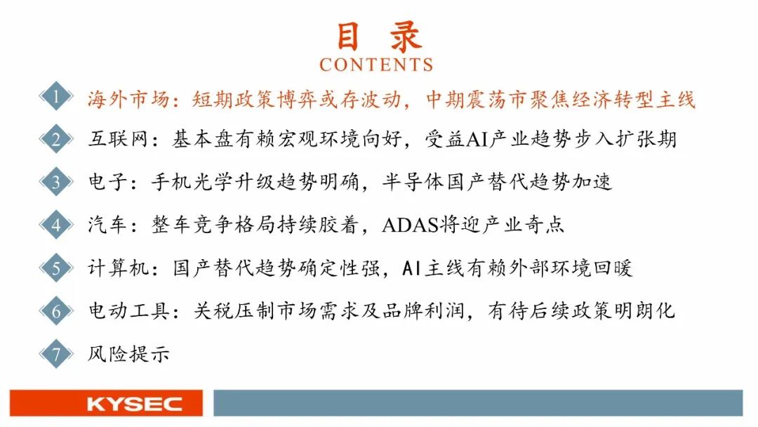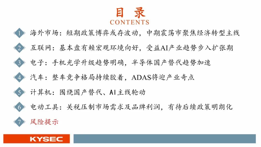 2、电子:(1)消费电子:光学是更优赛道,2025年手机光学升级持续、2025H2汽车ADAS下沉、 2025Q4 AR光学起量有望实现三重行业β共振。(2)半导体:下游低库存状态、国际形势不确定性催生补库存效应有望保证2025Q2晶圆代工企业业绩环比向上,中期需求仍需评估全球范围内终端需求边际下修、及补库存后的提前透支影响。