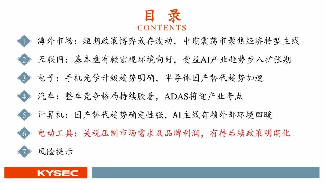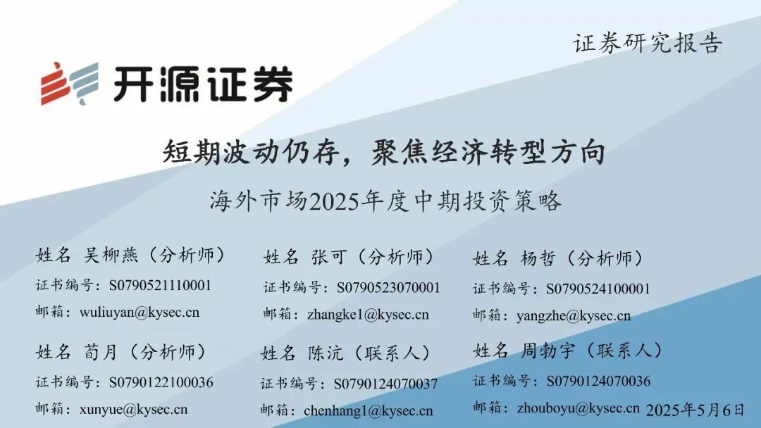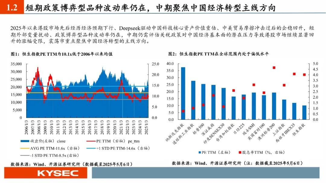 2025年以来,港股市场先后经历经济预期下行、Deepseek技术突破引发的中国科技核心资产价值重估、中美贸易摩擦冲击过后的企稳回升。如何把握2025年下半年港股市场投资机遇?近期,开源证券海外市场团队发布2025年中期投资策略《短期波动仍存,聚焦经济转型方向》,展望2025年下半年,开源证券海外市场团队认为,短期政策博弈型品种波动率仍在,中期仍需评估关税政策对中国经济基本面的潜在压力导致港股市场继续显著回升的涨幅受限,震荡市重点聚焦中国经济转型的主线方向。