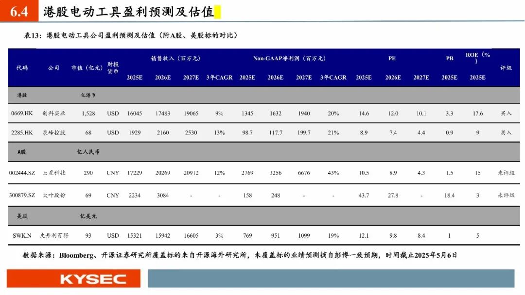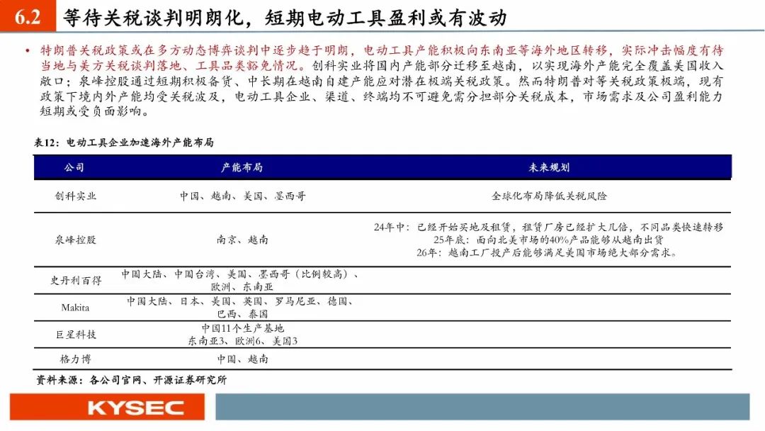 5、电动工具:关税压制美国当地市场需求、以及品牌供应链利润,有待后续政策明朗化,龙头积极加速产能全球化布局以缓冲短期盈利波动影响。