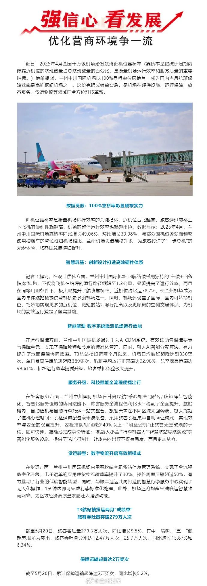 ★2、近日,2025年4月全国千万级机场始发航班近机位靠桥率(靠桥率是指统计周期内停靠近机位的航班数量占总航班数量的百分比,是衡量机场运行效率和服务质量的重要指标。)榜单揭晓,兰州中川国际机场以100%靠桥率位居榜首,成为国内当月航班保障效率最高的枢纽机场之一。这份亮眼成绩单背后,是机场在硬件设施、运行保障、旅客服务、货运物流等领域的全方位科技革新。(来源:兰州日报)