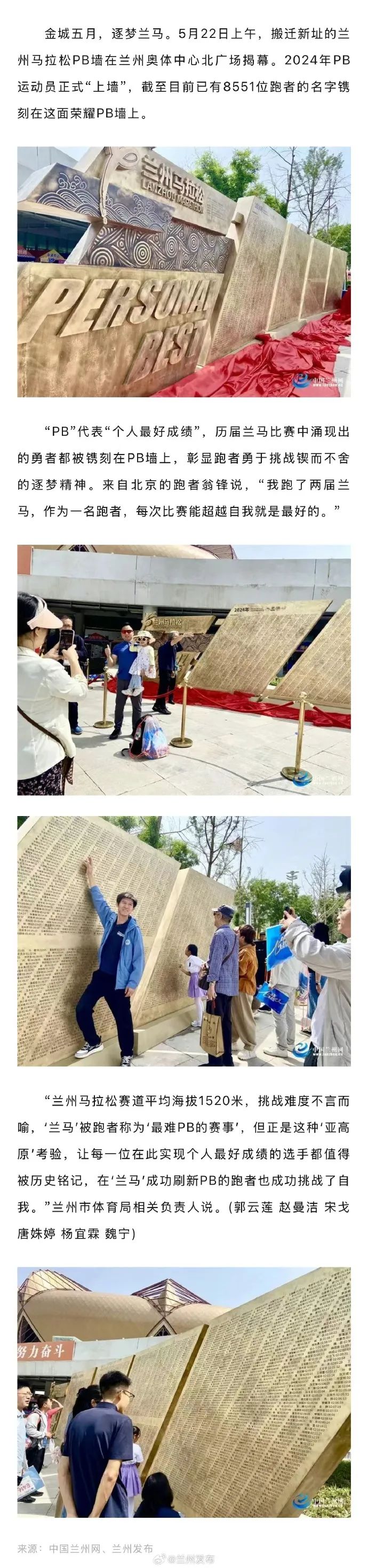 ★1、金城五月,逐梦兰马。5月22日上午,搬迁新址的兰州马拉松PB墙在兰州奥体中心北广场揭幕。2024年PB运动员正式“上墙”,截至目前已有8551位跑者的名字镌刻在这面荣耀PB墙上。