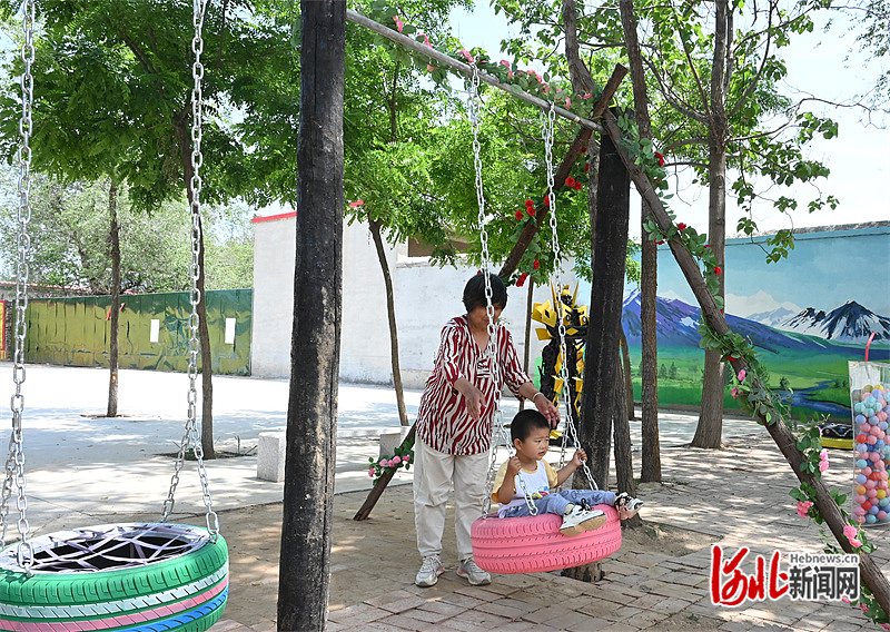 5月17日,在威县马家庄村广场上,一位村民带着孙子在废轮胎制作的秋千上玩耍。 河北日报记者 吕若汐摄