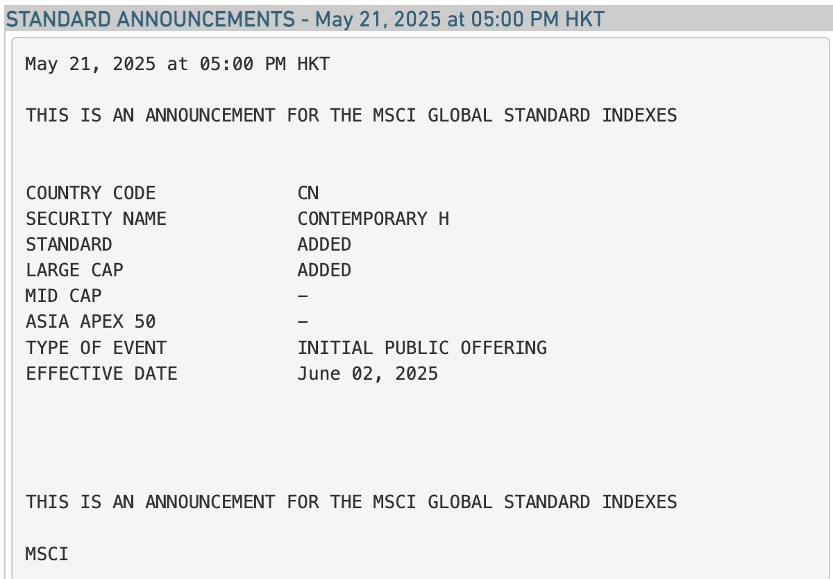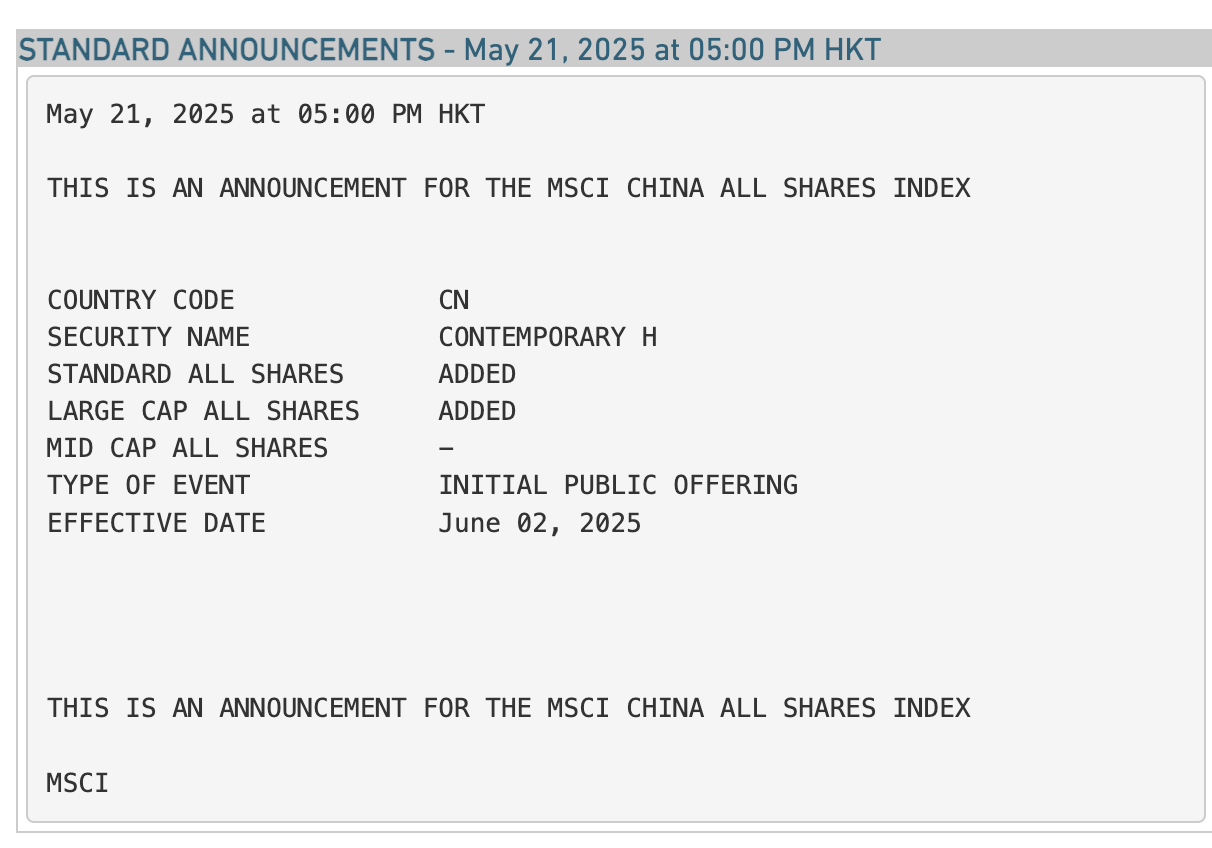 资料显示,2025年5月20日,宁德时代H股在香港联交所主板挂牌并上市交易。这意味着宁德时代H股刚上市即获MSCI指数纳入。