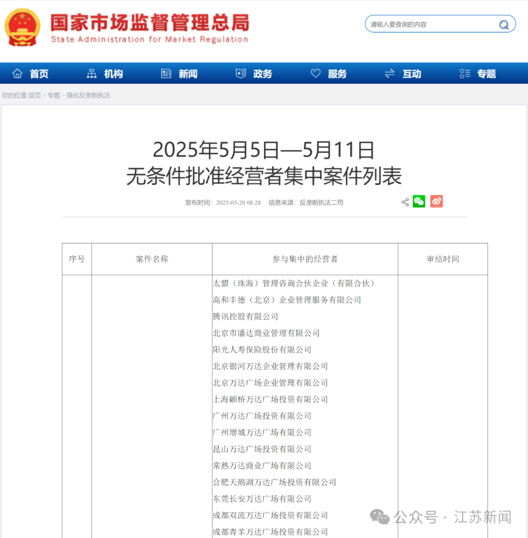 据国家市场监管总局近日披露的信息,太盟(珠海)管理咨询合伙企业(有限合伙)(以下简称“太盟珠海”)、高和丰德(北京)企业管理服务有限公司(以下简称“高和丰德”)、腾讯控股有限公司(以下简称“腾讯控股”)、北京市潘达商业管理有限公司(以下简称“京东潘达”)、阳光人寿保险股份有限公司(以下简称“阳光人寿”)直接或通过其各自关联方共同设立合营企业,并通过合营企业收购大连万达商业管理集团股份有限公司(以下简称“大连万达”)直接或间接持有的48家目标公司的100%股权。