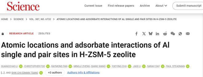 (来源:Science)最终,相关论文以《H-ZSM-5 分子筛中铝单位和双位点的原子位置和吸附剂相互作用》(Atomic locations and adsorbate interactions of Al single and pair sites in H-ZSM-5 zeolite)为题发在Science[1]。