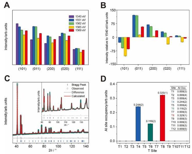 其四,实现了新技术的开发与应用。研究团队开发了一种多能量 RSXRD 技术,结合分子吸附实验能够直接解析沸石中铝原子的位置及其与吸附分子的相互作用。这一技术为沸石催化剂的精确设计和优化提供了强有力的工具。