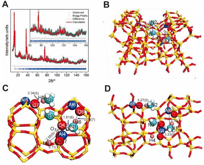 其二,实现了铝对的发现。通过晶体学方法,研究团队首次直接证实了 H-ZSM-5 沸石中存在“铝对”(即两个铝原子在空间上靠近形成 Al-O-Si-O-Al 结构)。铝对的存在对分子吸附和催化反应具有重要影响,尤其是在双分子反应中表现出显著的协同效应。