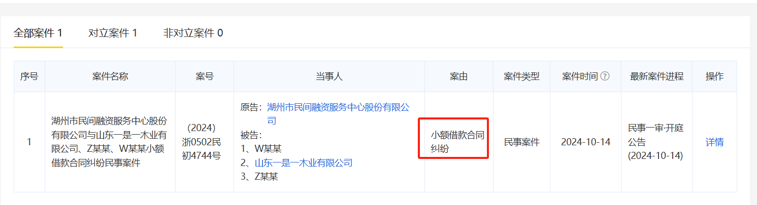 然而,好景不长,查询启信宝可知,2024年10月14日的一则开庭公告显示湖州市民间融资服务中心股份有限公司与山东一是一木业有限公司、Z某某、W某某发生小额借款合同纠纷。