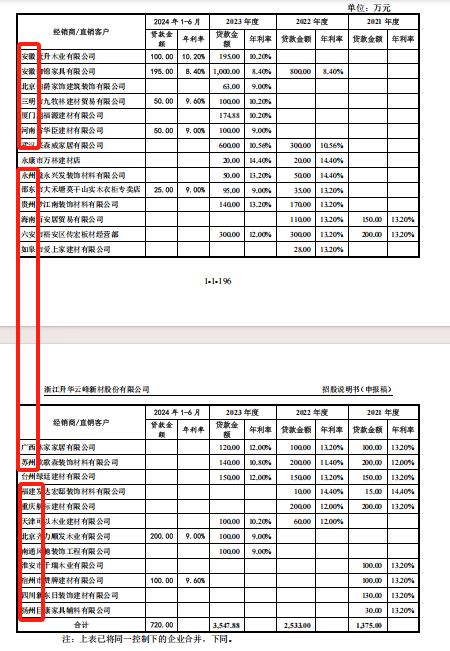 招股说明书显示,报告期内,升华小贷和湖州民融向浙江省外的云峰新材经销商、直销客户提供贷款的具体情况如下: