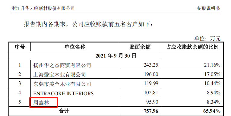 查询2022年3月21日披露的招股说明书,在应收账款前五名客户中赫然发现周鑫林,两位周鑫林是同一人,还是重名?