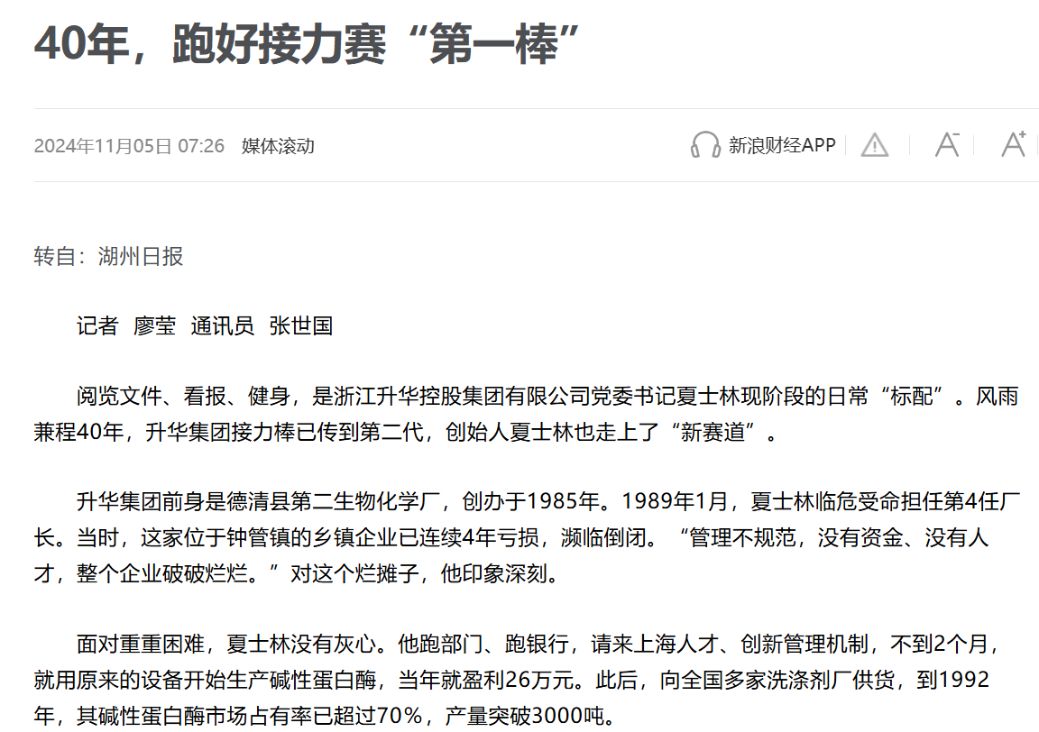 “做企业并非一个人的‘马拉松’,而是一群人、一辈辈人的‘接力赛’。”如今升华集团两代经营班子已平稳交接,继续保持稳健发展的良好势头,夏士林倍感欣慰。从2024年《湖州日报》的这则新闻可以看出,升华集团已经交棒到第二代,云峰新材实控人夏士林已经忙于看报、健身。