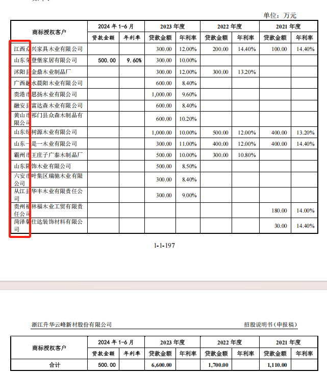 报告期内,升华小贷和湖州民融向浙江省外的云峰新材商标授权客户提供贷款的具体情况如下: