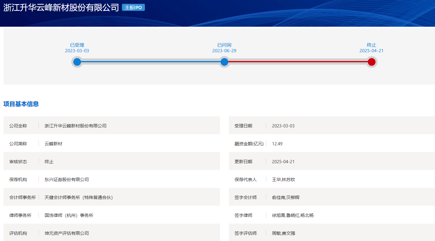 3月25日,上交所连发三份监管措施决定书,分别对浙江升华云峰新材股份有限公司(以下简称云峰新材),时任董事、总经理赵建忠,时任董事、财务总监、董事会秘书陈剑,保荐机构东兴证券的两名保荐代表人,申报会计师天健的两名签字注册会计师采取监管警示措施。