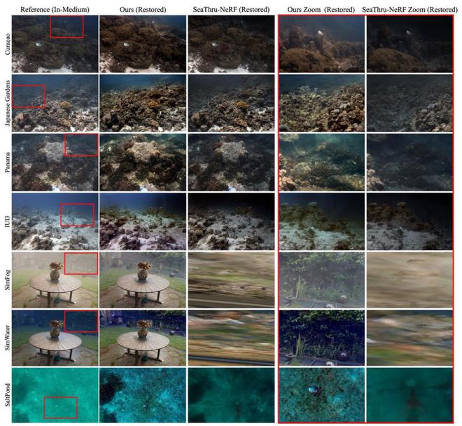 团队将 SeaSplat 应用于多个水下场景,包括红海、库拉索岛加勒比海海域、巴拿马附近太平洋等不同水况条件的图像(部分来自现有数据集),并在美国维尔京群岛通过遥控水下机器人拍摄的图像进行测试。