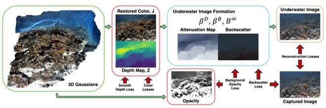 然而,3DGS 迄今仅成功应用于陆地环境。水下三维重建面临两大光学挑战:后向散射:光线在海洋微粒上反射形成的雾状光晕;衰减效应:特定波长光线随距离减弱的现象(例如远距离观察时红色物体比蓝色物体更易褪色)。
