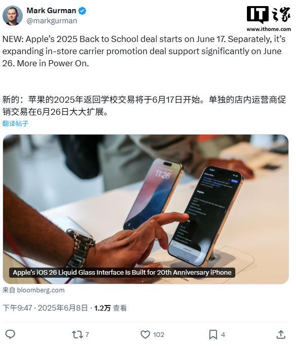 IT之家 6 月 8 日消息,据彭博社马克・古尔曼(Mark Gurman)透露,苹果公司将于6 月 17 日在美国(可能还包括加拿大)启动一年一度的返校季促销活动。