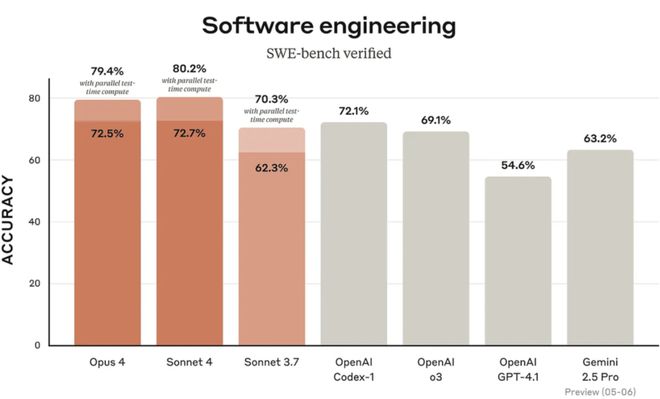 在软件工程基准测试SWE-bench中,Claude4与其他模型的比较