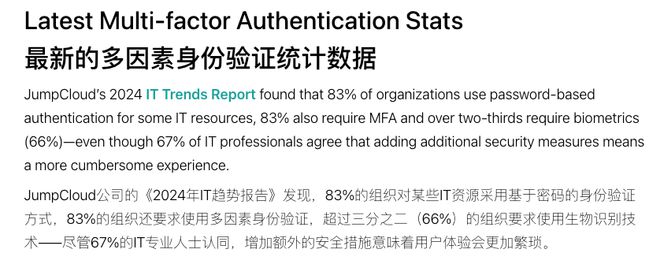 一家名叫 JumpCloud 的公司,在它的《2024年IT趋势报告》声称,83%的组织对某些IT资源采用基于密码的身份验证方式的同时,还要求使用多因素身份验证,另外超过三分之二(66%)的组织要求使用生物识别技术。