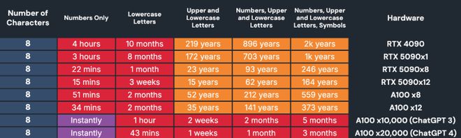 网络安全公司 Hive Systems 近日发布了其 2025 年密码表,年表显示,如果黑客拥有一张前段时间刚发布的 RTX 5090 的话,他们破解一个8位纯数字的密码只需要 3个小时。