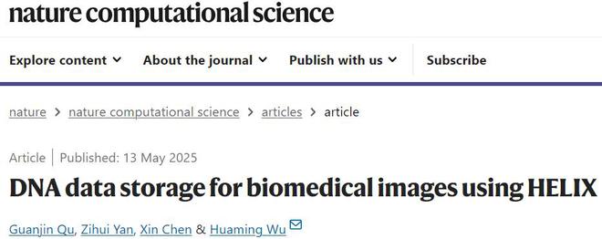 日前,相关论文以《使用 HELIX 进行生物医学图像的 DNA 数据存储》(DNA data storage for biomedical images using HELIX)为题发在Nature Computational Science(IF 12),Guanjin Qu 是第一作者,吴华明担任通讯作者 [1]。