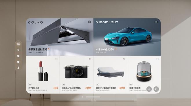 用户戴上 Apple Vision Pro,打开淘宝 app,可以直观看到大疆无人机的避障碍飞行、COLMO 空调气流在家里的循环模式、Vidda 投影仪在真实墙壁上的成像效果,甚至可以把小米 SU7“开”到樱花树下,“打开”后备箱放行李箱,“坐进”车里激活“Boost 模式”虚拟试驾。“震撼”“未来已来”“可以玩一整天”,不少用户体验后感叹。