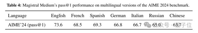 于是,这次Magistral的一个亮点就是支持多语言推理,尤其是解决了主流模型用欧洲语言的推理效果不如本土语言的缺陷。