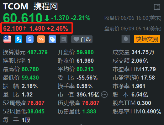 美股异动丨携程盘前涨2.5% 家庭旅游需求强劲 花旗予其“买入”评级
