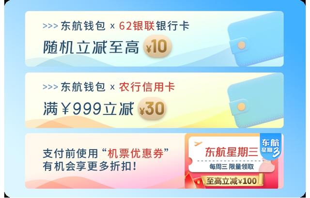 单人购机票,同样有优惠。活动期间,旅客可通过“东航星期三”活动领取50元国内机票券;而在支付阶段,通过东航钱包付款,有机会享购票随机立减优惠。